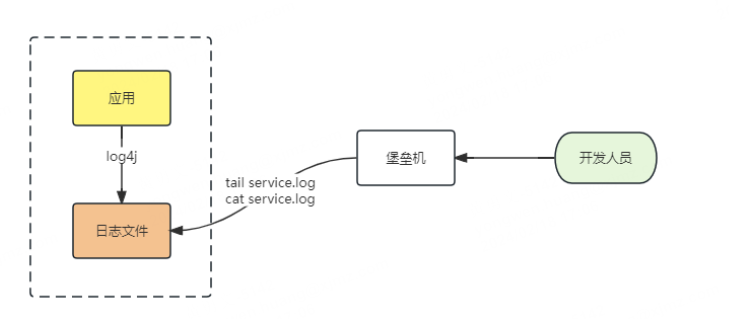 早期的原始架构,没有考虑到日志的记录和存储,通常开发人员直接登入线上服务器查看日志文件: