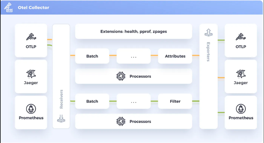 它可以单独部署,并定义如何转化流程,比如从 OTLP —> zipkin ;OTLP—> kafka ; 同时还可以定义一些批处理大小、内存限制等待。